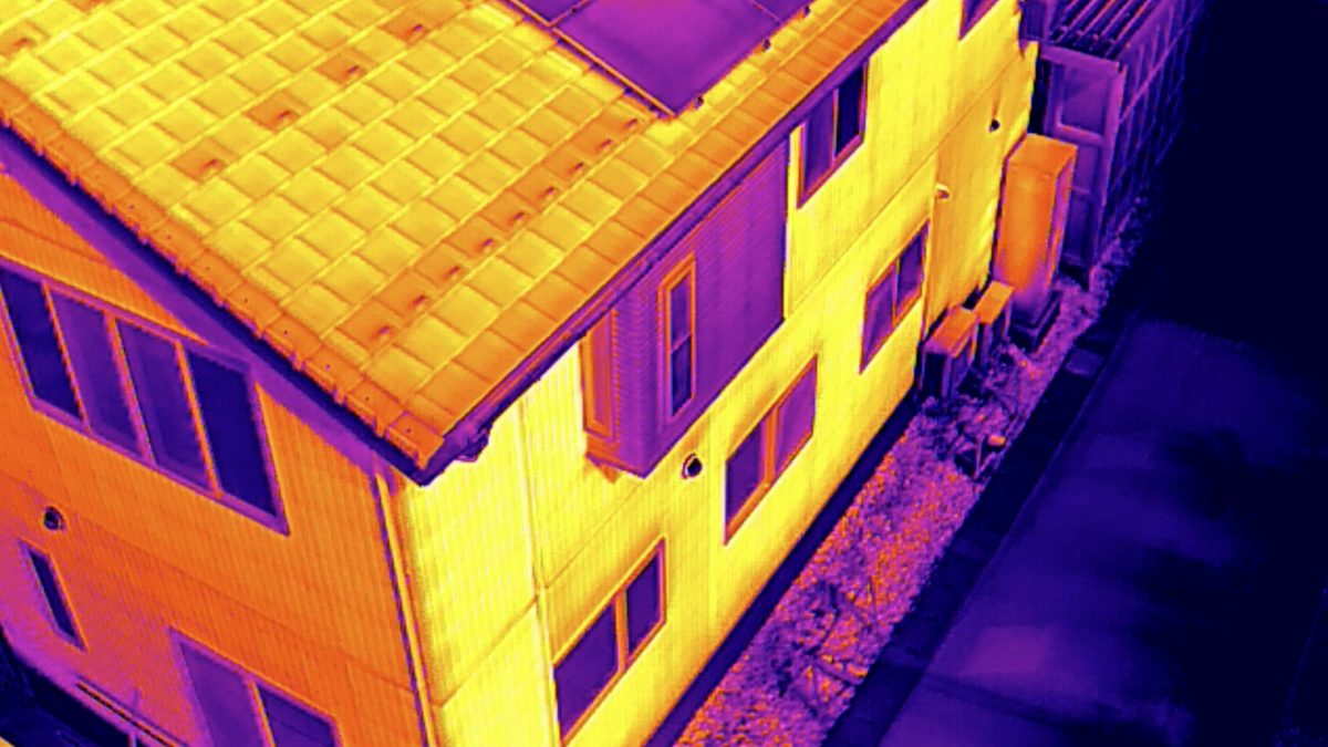 赤外線カメラを搭載したドローンは、肉眼では確認できない「温度差」を可視化することで、外壁内部の異常を検知します。